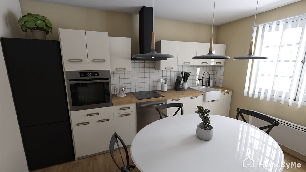 Pour contraster en douceur avec le mobilier aux teintes beige-rosée, j'ai choisi un très beau camel qui met en avant le potentiel de cette cuisine.
